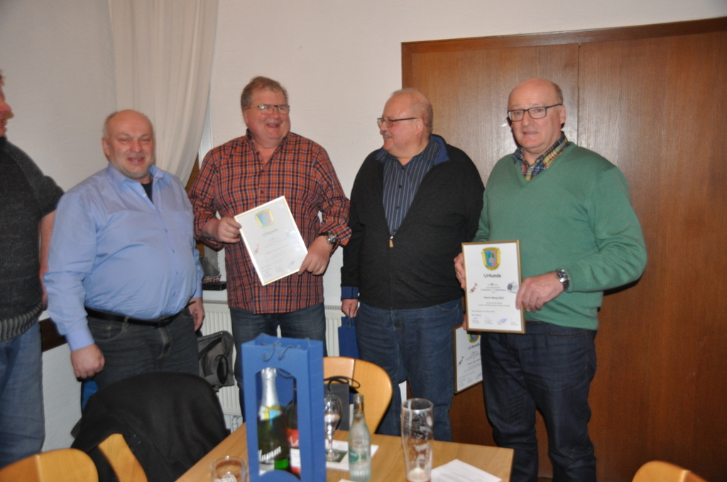 Im Tagesordnungspunkt Ehrungen wies der 1. Vorsitzende auf die Wichtigkeit der Vereinstreue auch der passiven Mitglieder für den Verein hin und ehrte die anwesenden Mitglieder Georg Geis, Gerd Orth und Andreas Plasche für 50-jährige Mitgliedschaft mit einer Urkunde und einem Weinpräsent. Er bedankte sich bei den Geehrten für ihre langjährige Treue zum Musikverein und ihr Engagement. Die Ehrungen der teilweise krankheitsbedingt nicht Anwesenden Ingrid Abelius, Bernd Jung, Jakob Jung, Willi Jung, Erich Schmitz und Lothar Schuy werden vom Vorstand nachgeholt. Gerd Orth bedankte sich für die Ehrung und erzählte der Versammlung mit Schmunzeln einige Anekdoten aus der Anfangszeit des Spielmannszuges/Musikvereins (Marschprobe im Kuhweg, Hessentage etc.), die von den Anwesenden mit Begeisterung aufgenommen wurden.
