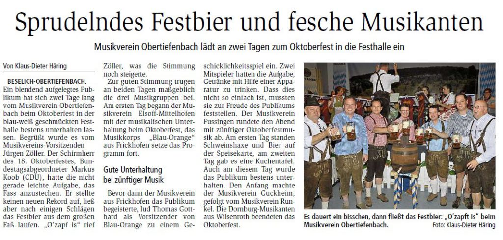 Nassauische Neue Presse: Sprudelndes Festbier und fesche Musikanten Beitrags-Autor:Kai Beitrag veröffentlicht:2. Februar 2020 Beitrags-Kategorie:Allgemein / Presse / Termin Das könnte dir auch gefallen 14. Oktoberfest am 3. und 4. Oktober im Bürgerhaus 20. September 2015 Musikverein spielt am Pfarrfest und beim Kommers des Kleintierzuchtvereins 10. Juni 2012 Neuer Vorstand beim Musikverein Obertiefenbach 1. März 2020