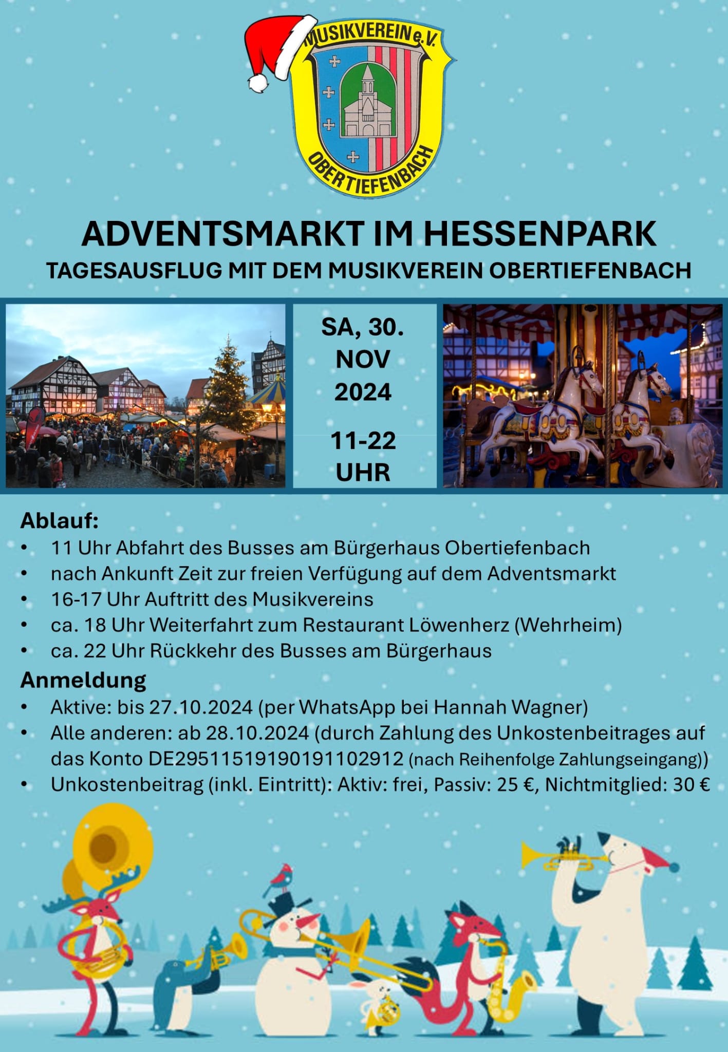 Abschließend wird auf dem Weihnachtsmarkt in Rennerod das erst Mal gespielt und zwar am Samstag den 14.12.2024 am Hubertusplatz. Die Aktiven treffen sich um 18:40 Uhr am Räumchen oder um 19:15 Uhr direkt am Hubertusplatz.